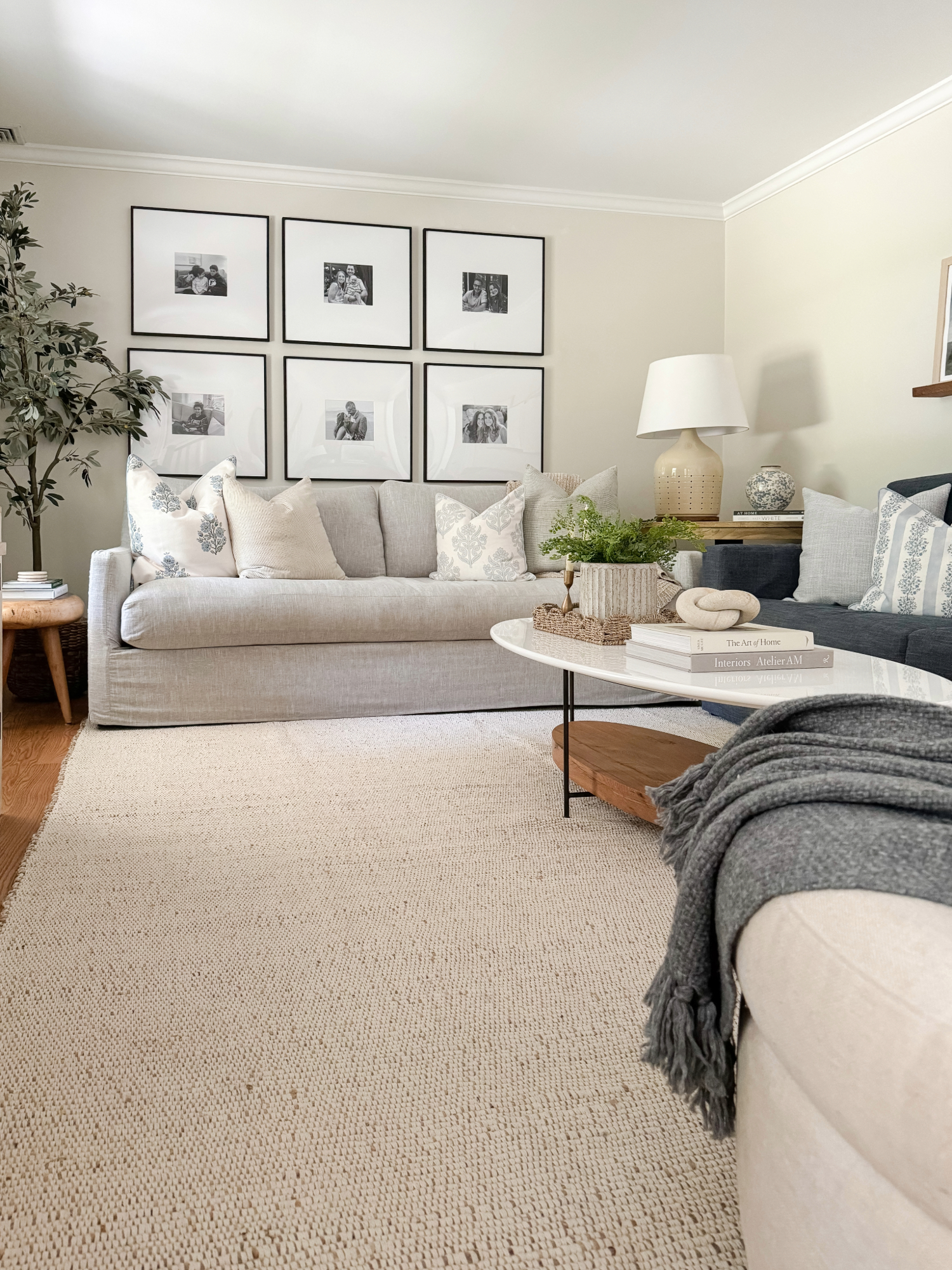 This sofa cover is just about the only way I have found to protect our sofas from pets. I also like to switch out my throw pillows seasonally to keep the living room looking fresh and coastal.