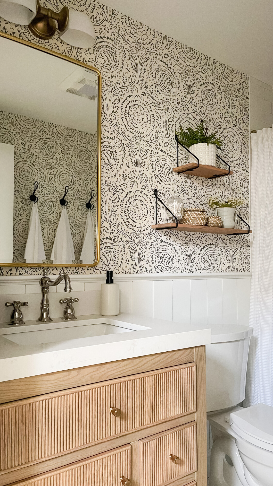 One decision that took me the longest was what to hang on the wall above the toilet. Since the vanity mirror is rectangular in shape, I wanted to add some dimension and add in a different shape. So even though the wall shelves are linear, they are stacked in different sizes which helps to draw your eye up.